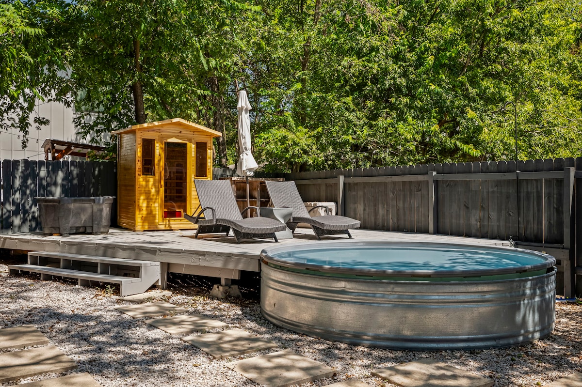 ¡Te damos la bienvenida a The Austin LoveStream! Este remolque vintage de 34 pies bellamente renovado (construido en 1971) combina el encanto retro con la comodidad moderna. En el interior, disfruta de aire acondicionado helado, calefacción central, un inodoro de descarga estándar y una cocina totalmente equipada con agua filtrada por ósmosis inversa. Sal a tu propio oasis privado, completo con jacuzzi, piscina de tanque de almacenamiento completamente nueva e iluminación ambiental acogedora. El LoveStream tiene que ver con la comodidad, el estilo y las buenas vibraciones de Austin.