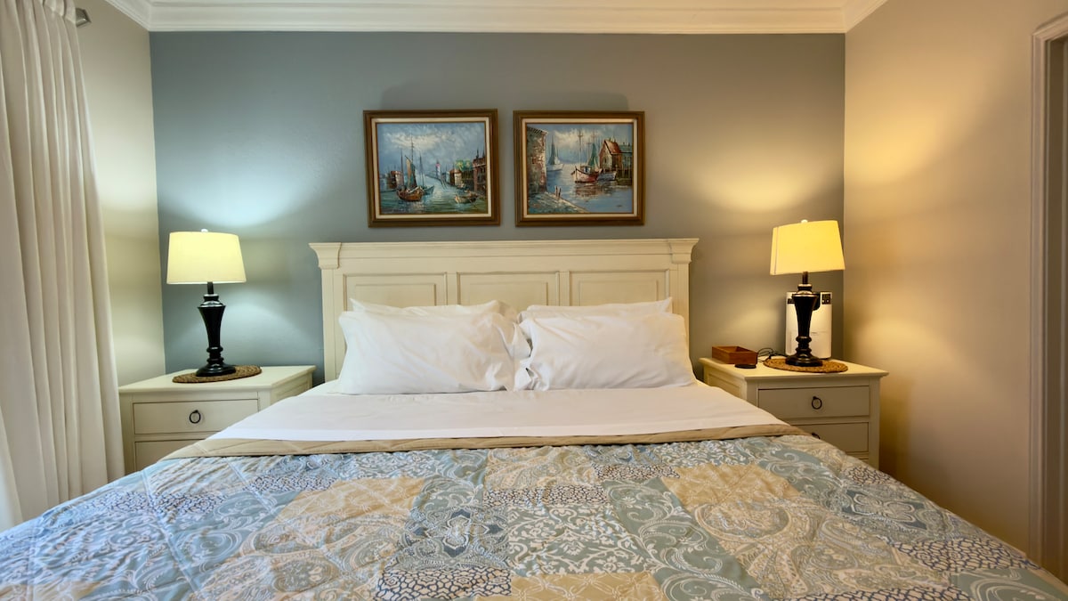 Apartamento de un dormitorio recién remodelado, totalmente amueblado, en el segundo piso con 1 cama tamaño king y 1 sofá tamaño queen. El apartamento cuenta con una cocina totalmente equipada para tu comodidad y confort. Tendrás acceso a la lavandería (sin cargo) y a la máquina de hielo del hotel en la misma planta. El aparcamiento gratuito está convenientemente fuera de la puerta del edificio.
