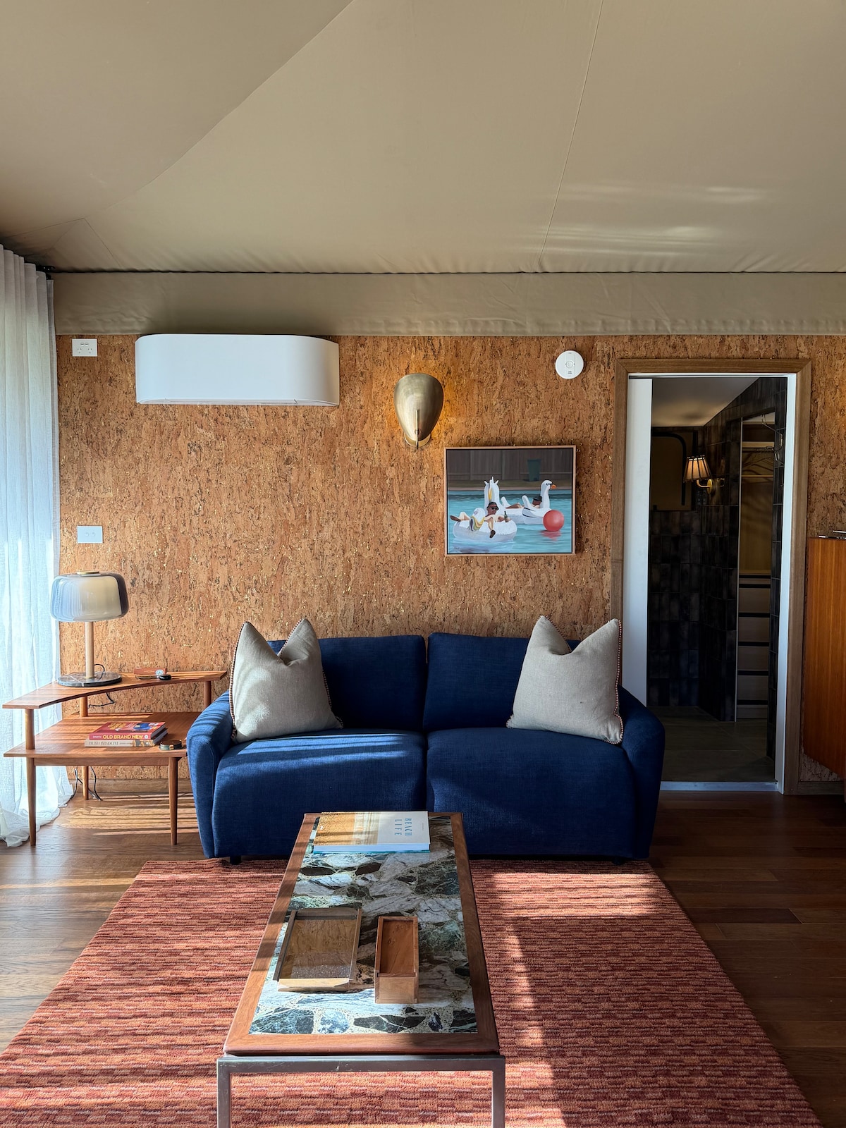 These tents sleep 2 adults only. Sorry, no pets or children are allowed in these ultra-luxurious glamping tents. With a large king-size bed and inviting doona, sofa, cosy reading lamps, dining table for two, and a crackling log fire in the main room, you will adore the subdued lighting and romantic atmosphere. Leather straps allow the walls to be completely opened up or closed down as you prefer. The spacious ensuite bathroom has a vanity, bathtub for two, a shower and of course toilet.
