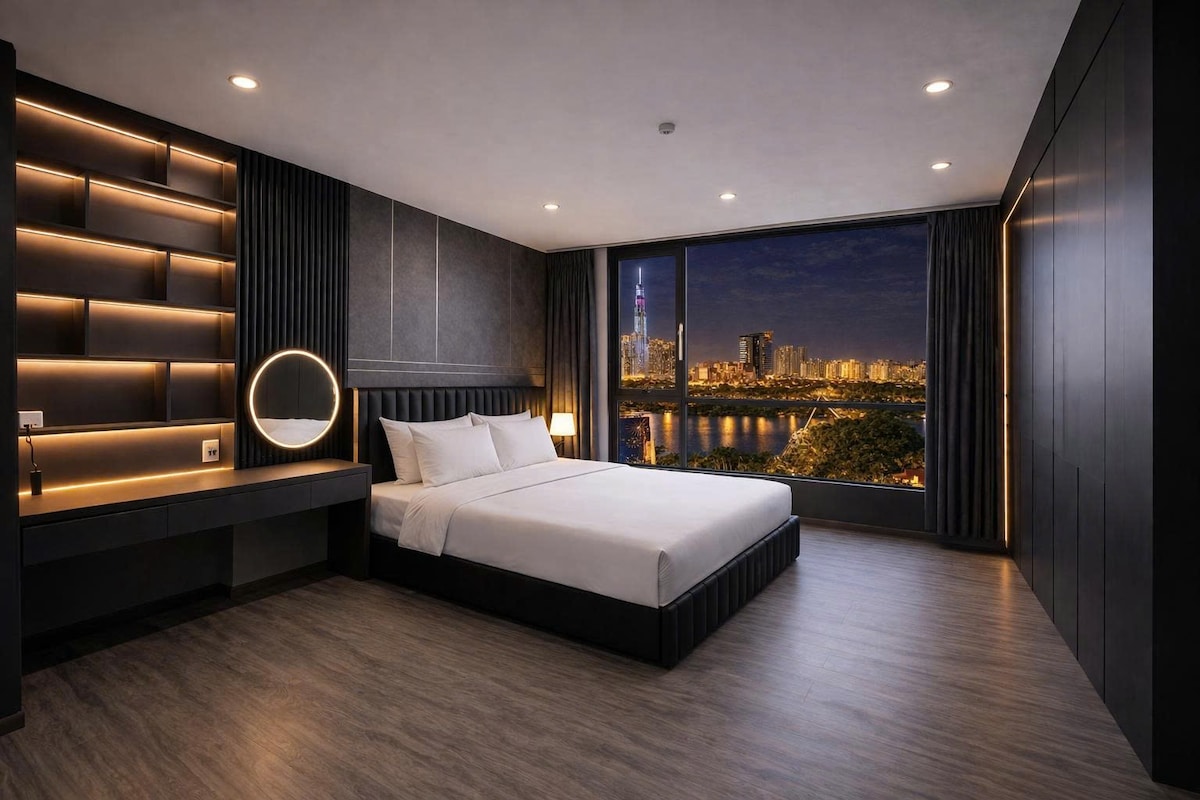 Luxury 5* The Opera Residence Corner Apartment by ChiHome - River View Bason District 1, The LandMark 81, The Galleria, The Mett Office, District 2 Sala Thiso Mall. - Torre B, Scala, nivel 1x unidad 10 - Tamaño: 70 m2 (unidad de esquina) - Incluye 2 dormitorios, 2WC, cómodos para alojarse de 2 a 4 personas. - Televisión inteligente de 65 pulgadas con Netflix y YouTube - Sofá, sillón, mesa de té. - Mesa de comedor con 4 sillas. - Utensilios de cocina completos. - Internet inalámbrico de alta velocidad disponible. • Aire acondicionado para toda la casa - Acceso 24/7 al edificio.
