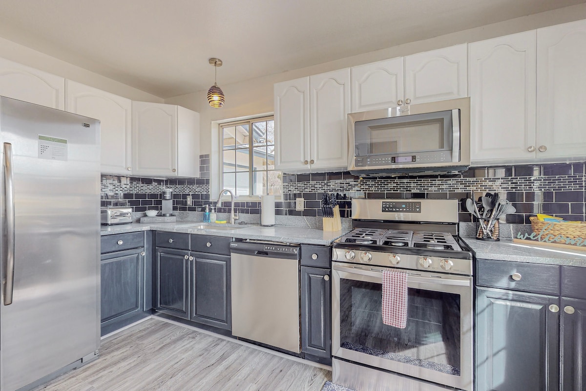 Ven y relájate. Disfruta de palomitas de maíz con toda la familia viendo Netflix en este tranquilo lugar para hospedarte. Barrio tranquilo, apto para familias y mascotas, a 10 minutos de Sandia Peak, con fácil acceso a la I-40, a la zona residencial, a rutas de senderismo por la montaña, al cine Icon, al parque y mucho más. Con un gran patio trasero vallado, cuenta con un aire acondicionado y calefacción nuevos. Además, dispone de un garaje para un auto. Nuestra casa está diseñada para ofrecerte una estancia cómoda y relajante.
