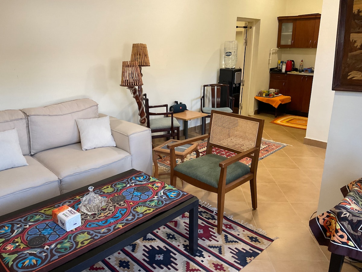 (¡No se permiten parejas sin certificado de matrimonio!) Relájate y desconecta en este alojamiento tranquilo y elegante. Estudio totalmente equipado y amplia terraza al aire libre con entrada totalmente privada y vista abierta en un complejo seguro y privado. Zonas verdes por todas partes y excelente ubicación cerca del aeropuerto de la esfinge y las pirámides, también fácil acceso a todo lo que puedas necesitar.