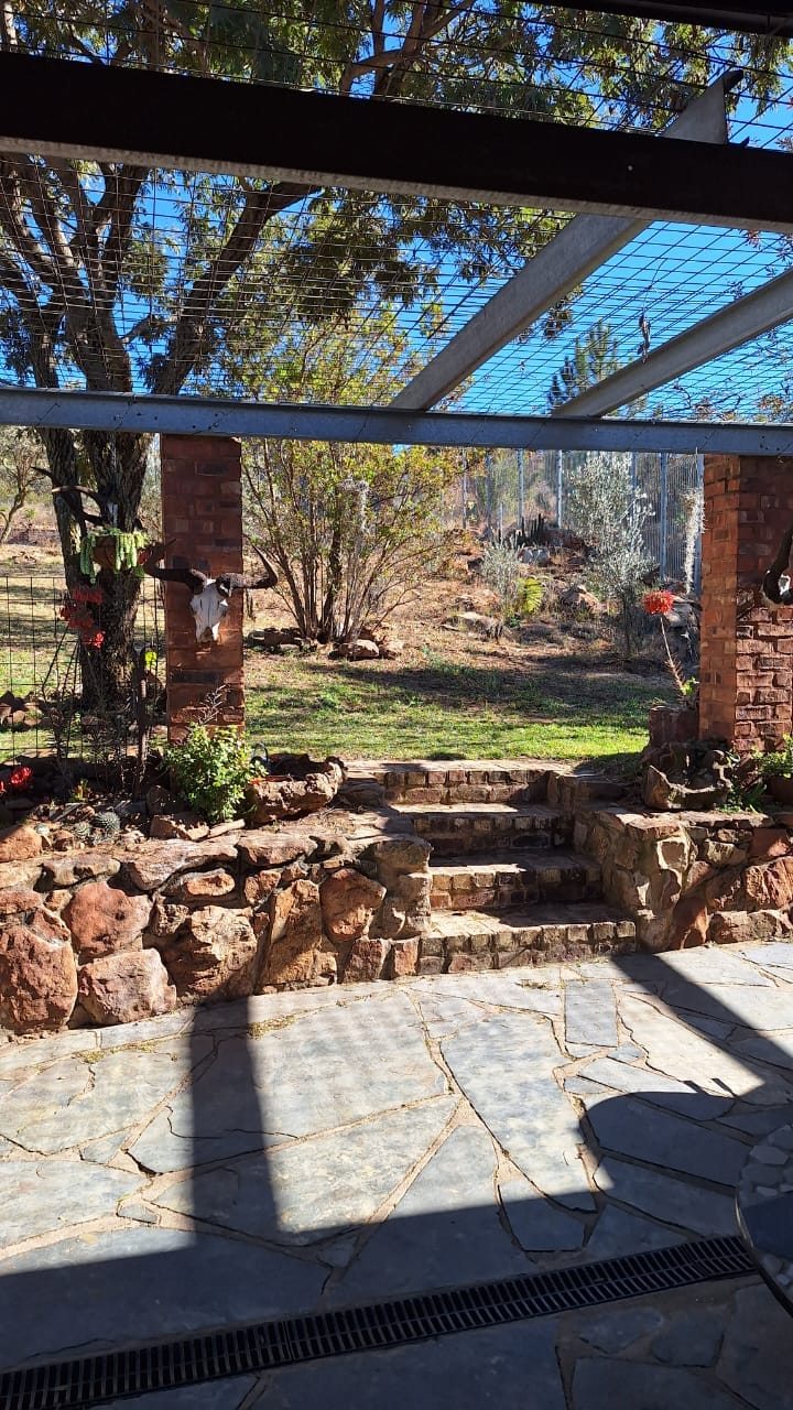 Vida en el campo con todos los servicios que disfrutarás en la ciudad. Un chalet de paja seguro construido con roca. Situado en una granja de 21 hectáreas de sabana. Hay muchas aves, impalas, blebok y jirafas deambulando. 1 dormitorio con cama tamaño queen y baño en suite. Salón de planta abierta con cocina totalmente equipada, comedor y salón con sofá cama doble tamaño queen y Dstv. Terraza fresca entre árboles. Hermoso jardín en terraza con zona de barbacoa (boma). Aparcamiento cubierto. Piscina añadida recientemente.