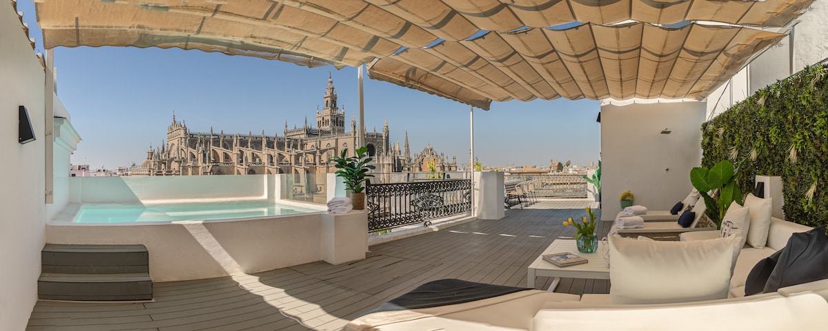 Este lujoso apartamento está en el corazón de Sevilla, frente a los tres Monumentos Patrimonio de la Humanidad: la Catedral, la Giralda, el Archivo de Indias y los Reales Alcázares. Con un diseño moderno, cuenta con 1 dormitorio, 1 baño, salón con Smart TV y cocina totalmente equipada con electrodomésticos de alta gama, como tostadora, batidora, horno, hervidor de agua y cafetera Nespresso. Además, tiene una terraza privada con impresionantes vistas a los principales monumentos de la ciudad.