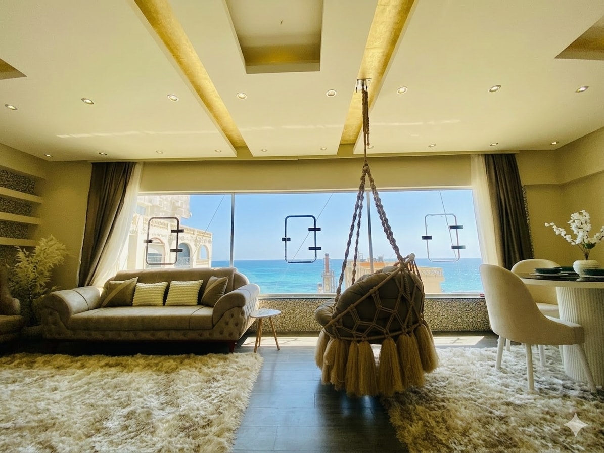 Wake up to the sight and cool breeze of the Mediterranean. This unique luxurious coastal apartment with it's boho chic laid-back style, is all about comfort. Enjoy the majestic open view of the sea &the Montaza royal gardens. Our unique spacious place has all the amenities you are looking for, restaurants and cafes are within a walking distance &affordable beach access. We are offering you our private place to enjoy during the time we are forced to leave it, hoping you like it as much as we do.