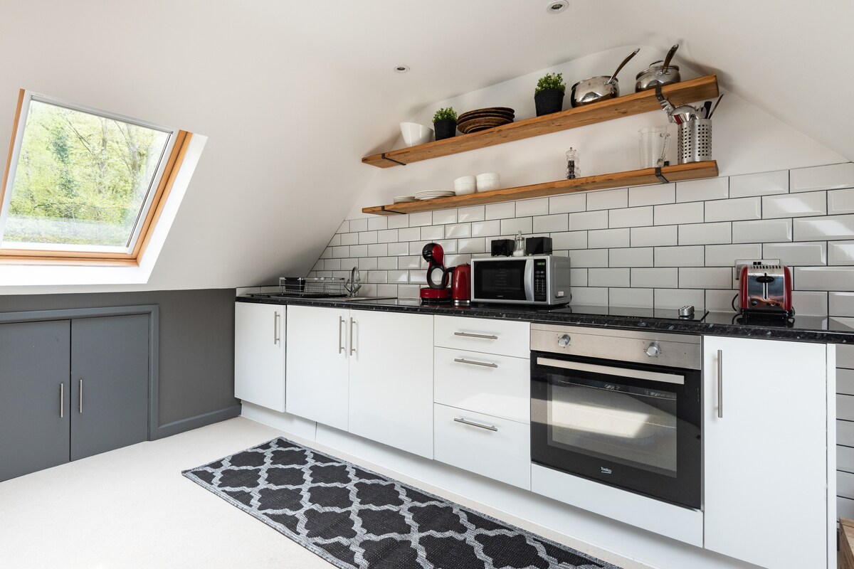Precioso apartamento tipo estudio con estacionamiento en la entrada, cerca del centro de la ciudad de Guildford. Cama tamaño king, cocina equipada con horno/microondas, nevera, cafetera Nespresso, televisor inteligente y baño con ducha eléctrica. Estamos ubicados en una zona muy tranquila, pero a solo unos minutos en auto del centro de Guildford. Nuestro jardín bordea el camino de North Downs, tan genial para los caminantes. Entrada privada (arriba de un tramo de escaleras) y estacionamiento gratuito detrás de puertas eléctricas. Leche, té, café, etc., y cualquier otra cosa que necesites.