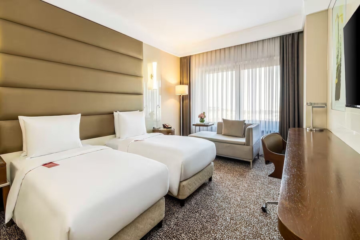 Ramada Plaza Istanbul Tekstilkent is located near shopping and business hubs. This deluxe city-view room with two twin beds is ideal for shared stays, offering scenic urban views. Guests can shop for top-quality brands at the nearby Forum Istanbul Shopping Mall.