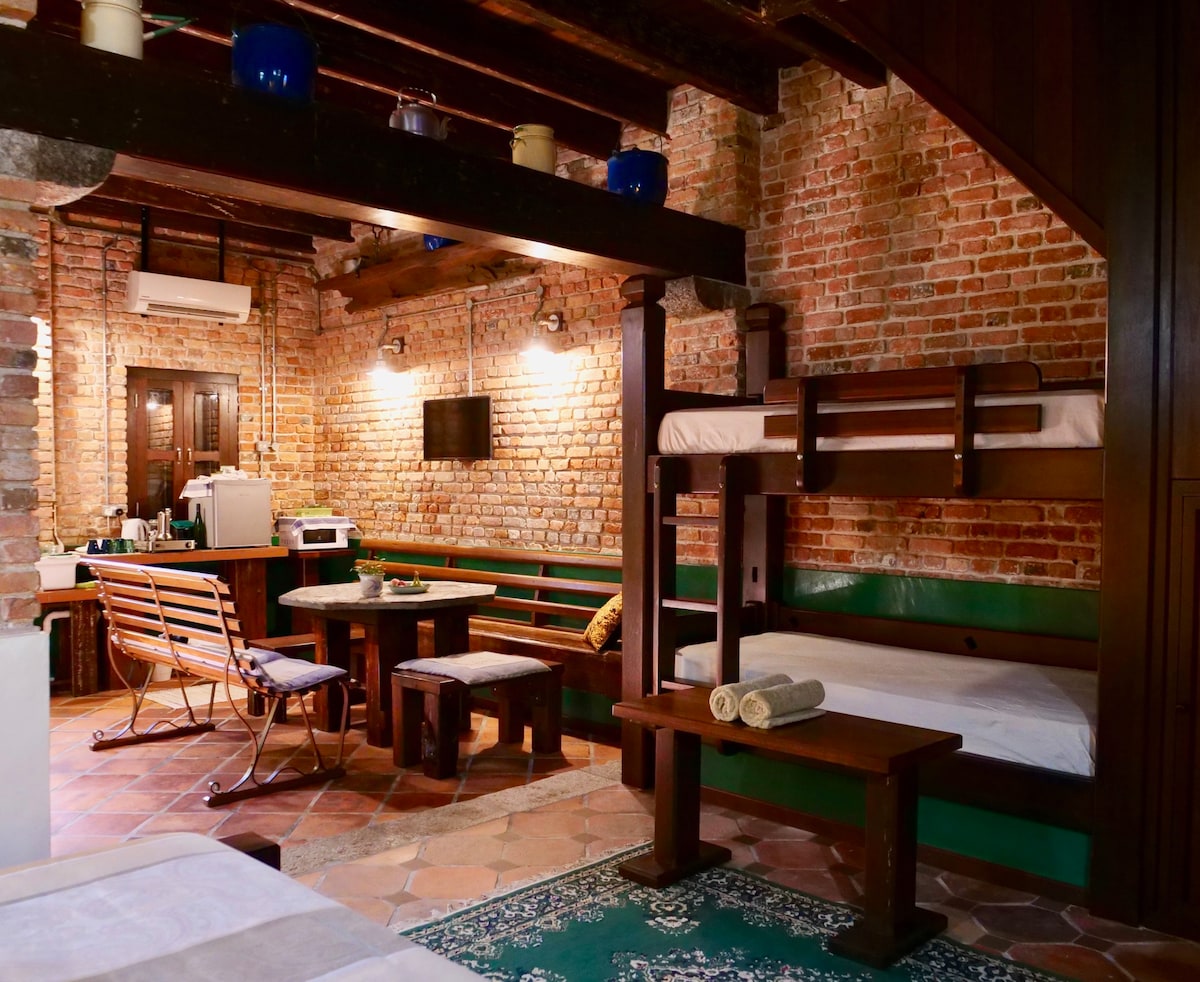 Welcome to our family owned, renovated and run historical home. A 100 year old shophouse in the heart of Georgetown, meticulously renovated from an existing birdhouse to its former glory. All renovation was carried out using recycled hard wood and red bricks. The electrical work and water piping are all exposed. The ground floor is terracotta and furniture has been constructed using cut-offs from roofing beams, old railway sleepers and window frames.