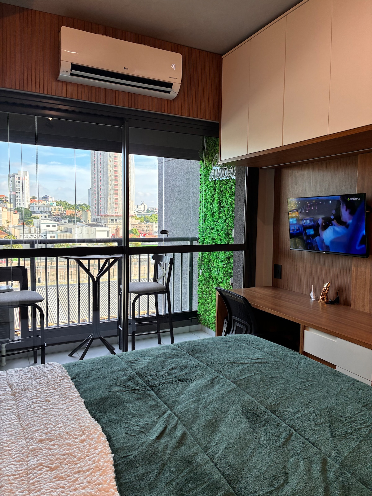 El estudio está ubicado en el piso 31 del edificio más alto del centro, con un diseño moderno y acogedor, así como una vista impresionante de la ciudad. Desde la ventana, puedes admirar el Valle de Anhangabaú, el Centro Histórico, las antenas de Av. Paulista: uno de los paisajes más hermosos de São Paulo. Es el edificio donde se encuentra SampaSky y es posible caminar a los principales atractivos del centro. Tiene aire acondicionado, TV de 55 pulgadas con aplicaciones, cocina equipada con utensilios básicos, encimera (1 boca), microondas y minibar.