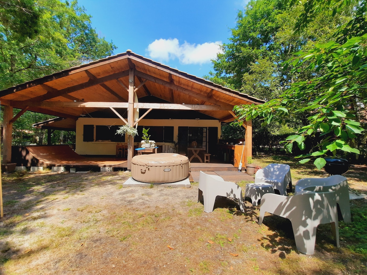 [¡Atención, no hay jacuzzi a partir de enero de 2024!] Descubre esta casa atípica con su rampa de skate privada, situada en el corazón del pinar de la Marina de Talaris, uno de los barrios más bonitos del lago, situado entre Lacanau-ville (3 km) y lacanau-Océan (-10 km). El barrio ofrece acceso privado al lago con pequeño puerto deportivo, playa y muchos senderos... ¡Las puestas de sol son impresionantes! También encontrará en el barrio una zona de ocio con: - Canchas de tenis, voleibol de playa, petanca (+ todo el material necesario); - Un gran bar-restaurante y su agradable terraza sombreada donde se organizan conciertos y actividades en verano; - Piscina exterior climatizada y compartida con los residentes/veraneantes del barrio; - Sala multi juegos (billares, futbolín, flippers...). - Clases de yoga, pilates, tenis, notación, etc. ¡Le ofrecemos acceso a todas estas instalaciones! El barrio está vigilado por un guardia día y noche y la velocidad de los autos se reduce para el bienestar y la seguridad de todos. Para los amantes de las bicicletas y los paseos, numerosos carriles bici desde la Marina le llevarán, según sus deseos, al lago, al puerto de Lacanau, al bosque, a la ciudad, a las playas de Lacanau-océan o, para los más intrépidos, hasta Burdeos. En cuanto a la casa: Es una casa de una sola planta de 100 m², ideal para personas con discapacidad. Consta de 4 dormitorios con capacidad para 10 personas (toda la ropa de cama se cambió en otoño de 2024). Dormitorio 1 : 1 cama doble 140x190 con fregadero y entrada independiente de la casa que da a la terraza. Dormitorio 2 : 1 cama doble de 160x200 con gran vestidor. Dormitorio 3: litera de 2 individuales + 1 cama doble de 160 x 200 Dormitorio 4: cama doble 140x190 con fregadero + ducha independiente. Sala de estar abierta con cocina totalmente equipada (horno, microondas, lavavajillas, heladera+congelador, cafetera de filtro + cafetera nespresso, licuadora, tostadora y muchos otros electrodomésticos), comedor y sala de estar. Un cuarto de baño con ducha a ras de suelo e inodoro. Un segundo inodoro separado y una segunda ducha independiente contigua a una de las habitaciones. Wifi, lavadora, SmartTv (no ADSL pero acceso a youtube, Netflix, Amazon Prime, etc. si tiene una cuenta). Posibilidad de tener cuna, silla y bañera portátil previa petición. La casa está rodeada de un jardín y consta de una gran terraza cubierta de madera de 70m2 orientada al sur. ¡Ideal para vivir al aire libre incluso con mal tiempo! ¡Encontrarás una cocina exterior con plancha, fregadero, parrilla y rampa de skate privada! DURACIÓN DEL ALQUILER JULIO-AGOSTO: DE DOMINGO A DOMINGO ÚNICAMENTE. Atención: NO SE PROPORCIONA ropa de cama (sábanas y toallas de baño). Posibilidad de reservar ropa de cama en una lavandería de la zona. La casa está situada en una zona tranquila, la mayoría de los vecinos viven allí a tiempo completo, por lo que es importante respetar la tranquilidad, especialmente después del anochecer. La limpieza no está incluida. El alojamiento debe devolverse en el mismo estado que a la llegada: limpio y ordenado. Llegada: a partir de las 16:00 Salida: 10:00 como muy tarde Lago a 900 m // Campo de golf a 8 km // Tiendas, supermercados, correos, farmacia, mercado, panadería, carnicería a 3 km // Océano a 10 km // Playa de Moutchic (baño vigilado, alquiler de barcos, windsurf, canoas y botes a pedales) a 4 km // Centro ecuestre a 500 m // Aeropuerto de Burdeos a 40 km. BONUS SURF: ¡Posibilidad de reservar clases de surf o alquilar equipos en nuestra tienda de surf Matahari! ¡Más información a petición! 🌊🤙