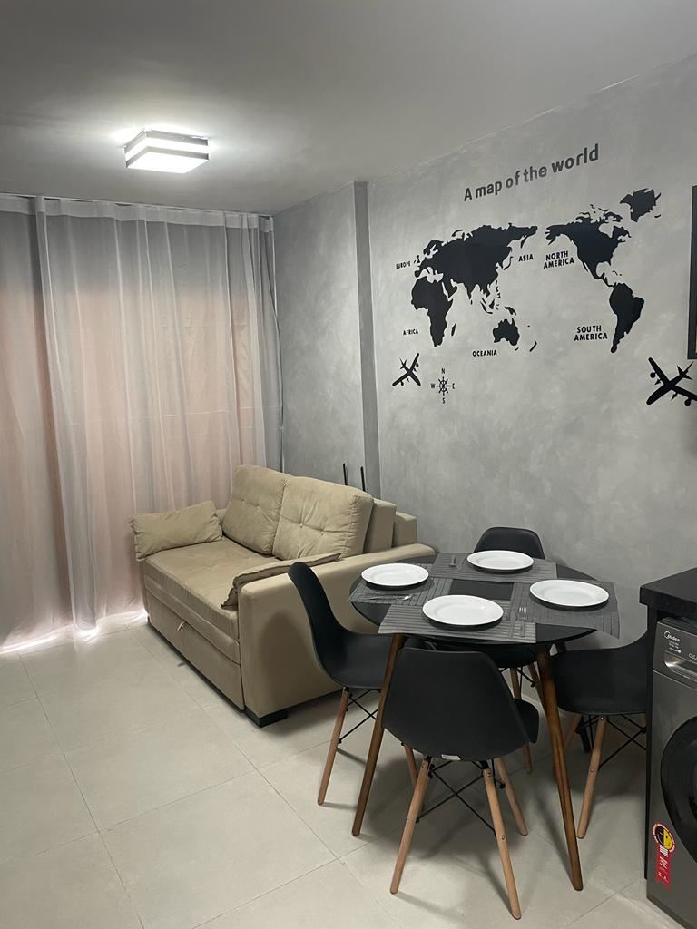 Apartamento super confortável tipo studio com localização imbatível para seus compromissos de trabalho e/ou lazer. ► Cama de casal com colchão de molas; ► Smart Tv 40” (incluso Netflix, Prime Video, Disney+ e Globoplay); ► Ar-condicionado; ► Ventilador turbo; ► Persiana tipo blackout; ► Roupeiro com cabides; ► Caixinha de som bluetooth; ► Mesa de estudos/trabalho com luminária; ► Sofá-cama para casal; ► Mesa para alimentação; ► Cozinha equipada para preparar pequenas refeições.