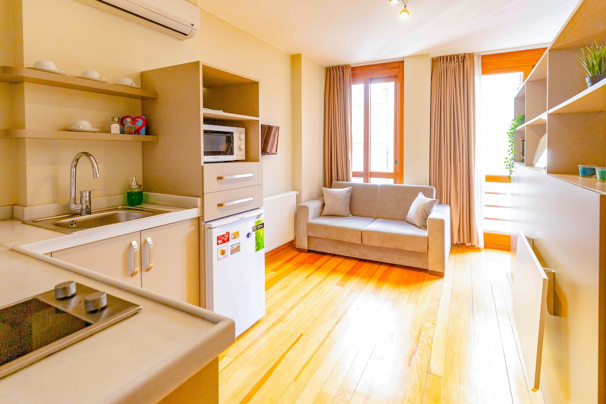 Ubicado en el animado barrio de Pera de Beyoğlu, este estudio compacto pero cuidadosamente diseñado es perfecto para un máximo de 3 huéspedes. Ubicado en un nuevo edificio art déco, maximiza el espacio con estilo y practicidad, ofreciendo todo lo que necesitas para una estancia cómoda en Estambul. A solo 5 minutos a pie del metro y cerca de las principales atracciones turísticas, tendrás fácil acceso a sitios históricos, tiendas de moda y restaurantes vibrantes. Experimenta el encanto y la energía de Estambul.
