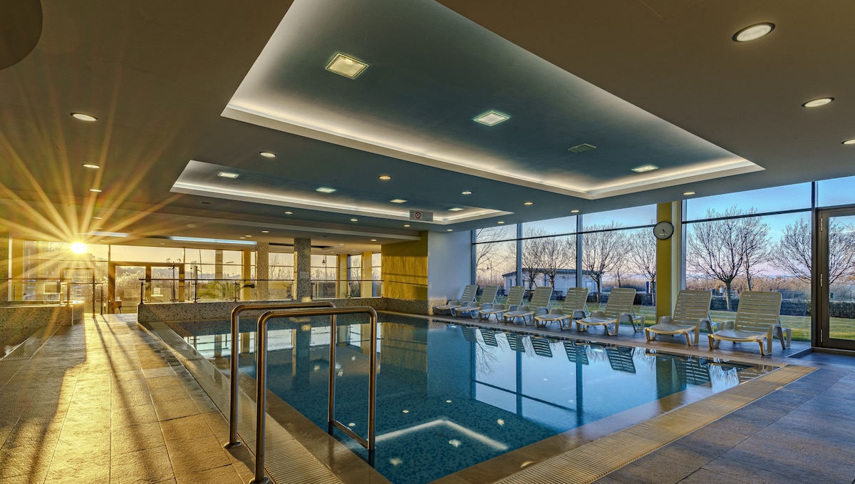 Nuestro departamento Gold Penthouse se destaca por varias razones. Dado que el departamento está ubicado en el noveno piso del complejo, desde su enorme terraza se puede disfrutar de una panorámica circular única. El Paseo Petőfi y el centro de la ciudad están a poca distancia. También merece la pena aprovechar nuestro departamento de bienestar.