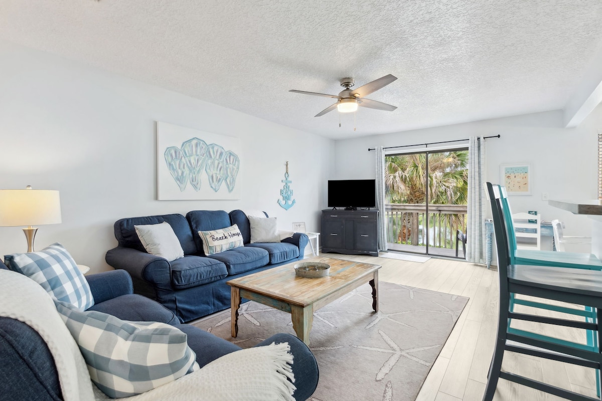¡Te damos la bienvenida a tu retiro de playa bohemio en Fernandina Beach! Este condominio actualizado de 2 dormitorios y 1,5 baños está a solo 2 cuadras de la playa y a minutos del centro. Ideal para familias o trabajadores remotos: disfruta de wifi rápido, un espacio de trabajo y espacios tranquilos al aire libre. Relájate junto a la piscina, juega al tenis o explora Fort Clinch y los senderos cercanos. Con muebles nuevos, una cocina completa y dormitorios acogedores, tu estancia ofrece comodidad y conveniencia al alcance del oído de las olas del océano. ⭑COMUNÍCATE CON NOSOTROS PARA OBTENER DESCUENTOS DE TEMPORADA⭑