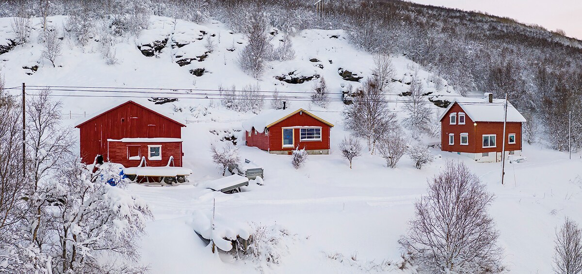 Cabaña con sala de estar, cocina y baño. Un dormitorio con cama matrimonial y loft con colchones. Sofá cama en la sala de estar. Capacidad para 3-4 personas Cables de calefacción en los pisos y leña. Wifi. A poca distancia de Reisaelva, las montañas y el mar, y las pistas aprobadas para motos de nieve. Puedes experimentar el trineo de perros en un desierto virgen bajo un cielo lleno de las luces del norte. Consulta la información en las guías. Si quieres cocinar al aire libre o simplemente disfrutar del silencio alrededor del fuego, aprovecha nuestra barbacoa en la azotea en Reisaelva.