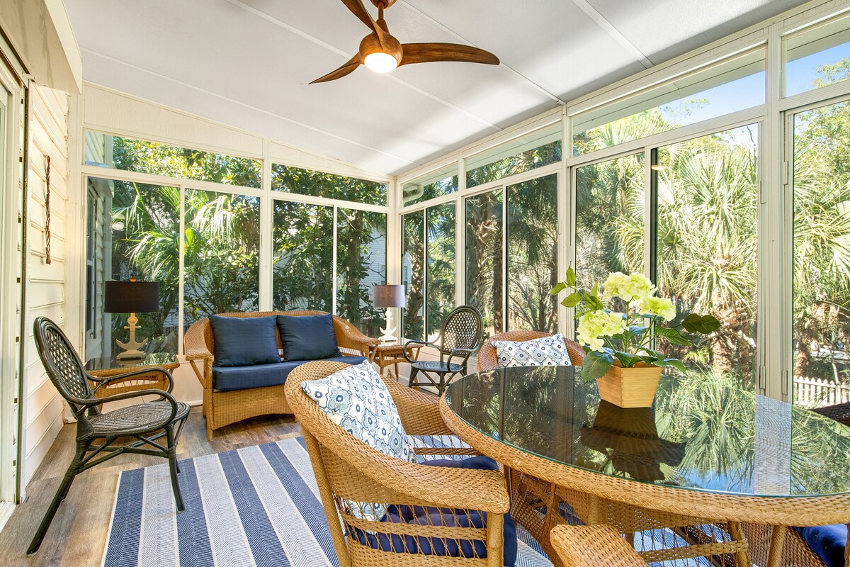 Palmetto-lined home w/ porches, yard & near beach