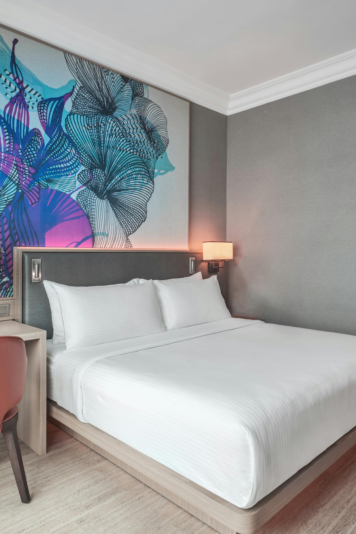 Unwind your stay in Hotel Royal Plaza on Scotts's roomy Deluxe King Room, where chic design meets cozy comfort. Relax under the room's walk-in rainshower and sink into our plush Simmons Dream Bed, ensuring you drift into restful slumber every night. Size: 32sqm | 344sqft Room Maximum Capacity: 2 Adults & 1 child (below 11-years-old in existing bedding)*