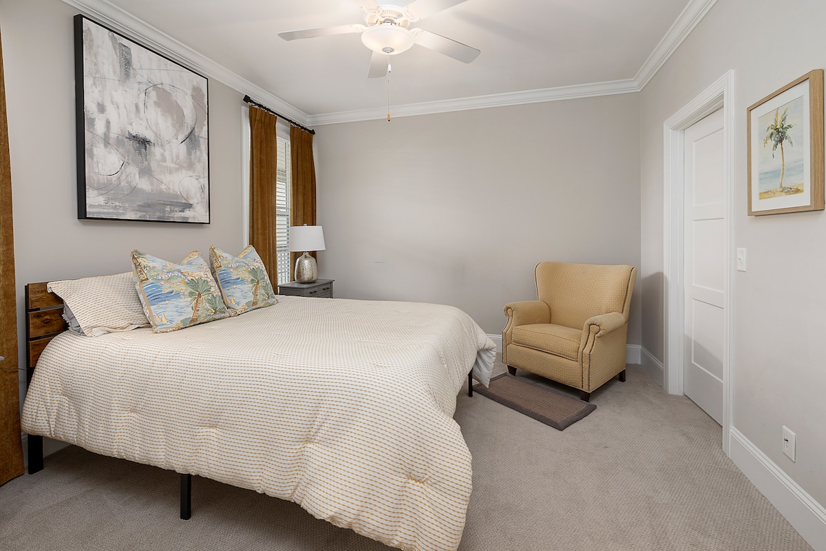 Bienvenido a tu propia casa del árbol en una cabaña en la isla, toda una nueva construcción con un tema de comunidad de playa, con encanto sureño. Para llegar a tu cabaña estudio de 600 pies cuadrados, usa la entrada privada para acceder a la escalera. Junto con un baño completo y una cómoda cocina americana, te damos la bienvenida a un gran espacio abierto con puertas corredizas dobles de vidrio que te llevan a tu propio balcón privado de 180 pies cuadrados ubicado entre los robles vivos. Se considerarán todas las reservaciones de huéspedes con historial favorable.