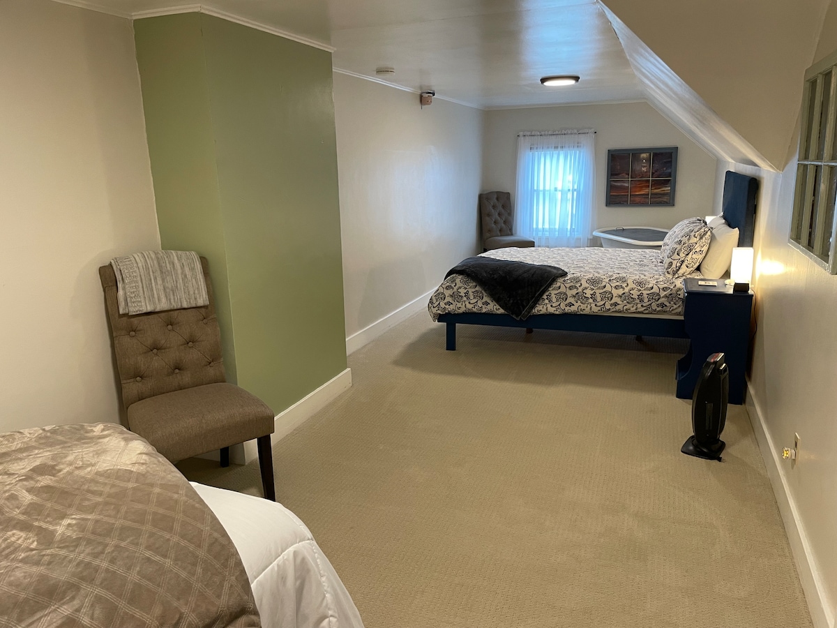 Amplia suite en la planta superior perfecta para dos adultos. Dormitorio de gran tamaño con cama tamaño queen y una cama doble adicional. Cómoda sala de estar para disfrutar del café por la mañana. La suite tiene su propia entrada y es completamente privada, incluyendo el baño, y se encuentra en el tercer piso (sin ascensor). La casa se encuentra en el Registro Histórico Nacional 1905 - 2º en los cuarteles de oficiales al mando. Explora Fort Stevens en el río Columbia y el océano Pacífico, a pocos minutos. Astoria, Seaside y Cannon Beach están cerca.