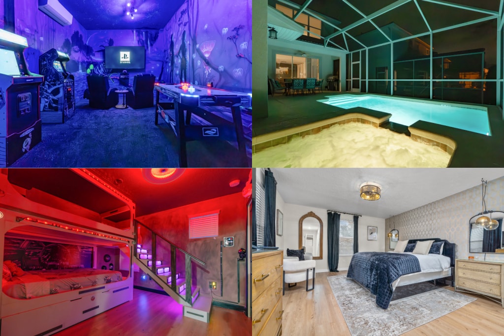 Diseño elegante, comodidad de lujo y entretenimiento sin fin, con una amplia terraza de piscina de 2200 pies cuadrados orientada al suroeste y cocina al aire libre, sin vecinos traseros en un hermoso bosque en el impresionante Reunion Resort de 3,5 millas cuadradas. Tendrás tu propia piscina privada con spa desbordante, sala de cine, sala de juegos de billar, 4 salas temáticas: ESPACIO EXTERIOR, SUPERHÉROES DE MARVEL con un TOBOGÁN DE TUBO, FROZEN II, ARMARIO DE HARRY POTTER, PS5, a pocos minutos de Disney.