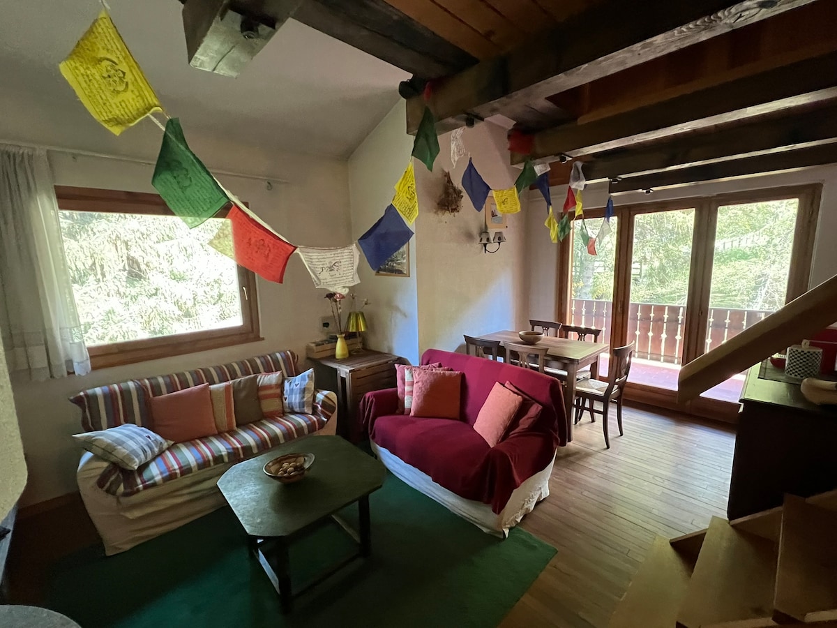 Alps Mountains. Italy. Aosta Valley. A cabin in a small village at 1600 meters,in the peace of meadows, grazing cows and mountains. Snow (usually) in the winter. A place of the heart, lovingly restored preserving the ancient beams of the roof. A wonderful view from the large windows and a special tranquility for those in search of peace, warmth and relaxation. The furniture is very nice: wood above all, but also more lively colors, and modern comforts. Quiet excursions, both on snowshoes or ski.