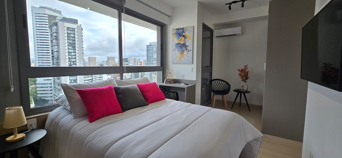 Bienvenidos y siéntanse como en casa. El piso es nuevo, diseñado especialmente para vosotros y tiene una decoración impecable, muy práctica para el día a día. ¡La vista es espectacular! El piso está en la 28ª planta. Estamos en una excelente ubicación en São Paulo, en el barrio de Pinheiros, con restaurantes, supermercados y panaderías muy cerca. Tiene 40m2 con 1 habitación y 1 baño. A poca distancia de la estación de metro Fradique Coutinho (sólo 2 cuadras).