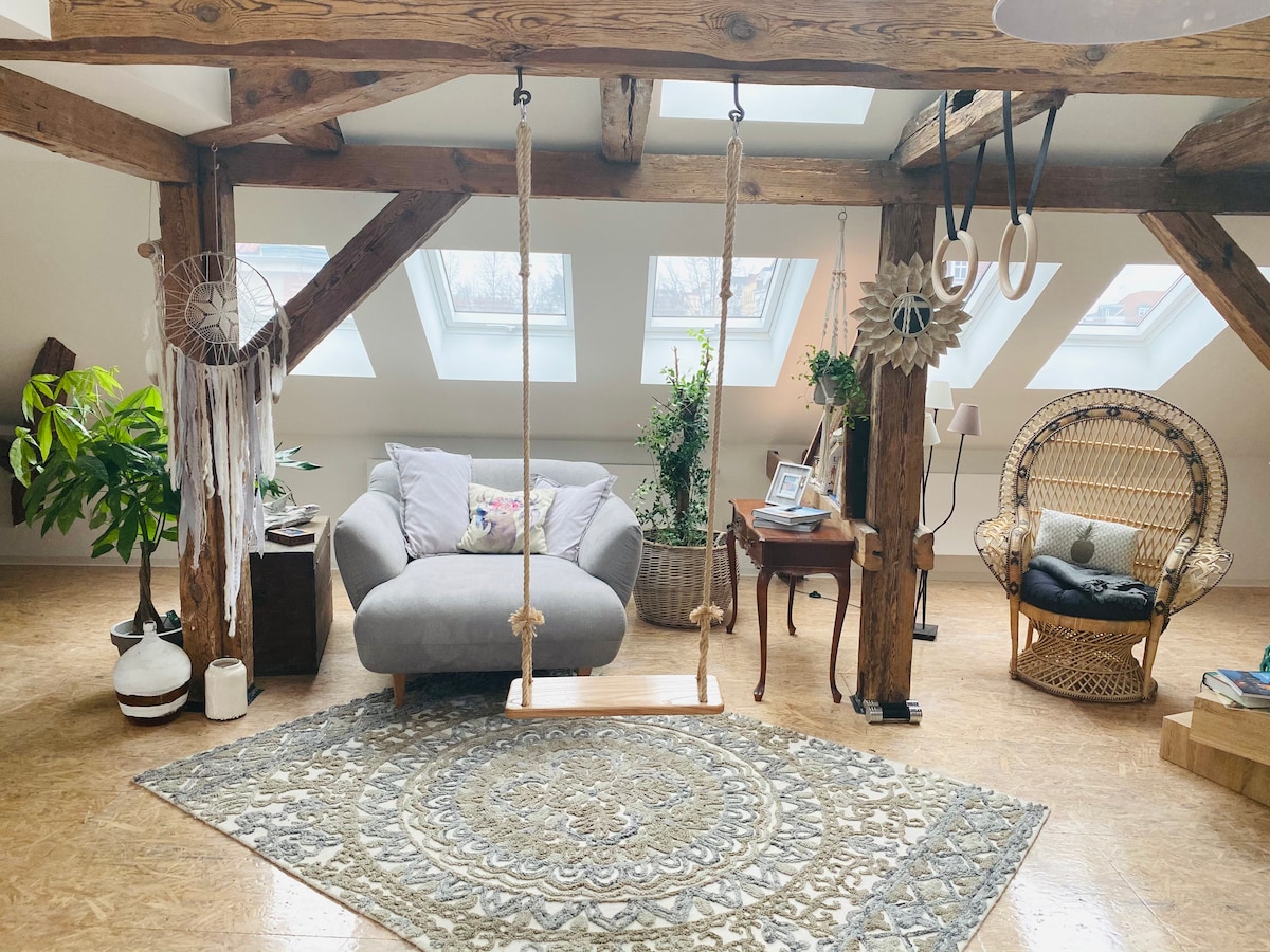 Siéntate y relájate en este tranquilo y elegante alojamiento bajo el techo. Recupera fuerzas y encuéntrate a ti mismo durante un tiempo de descanso. Disfruta de un paseo por el bosque adyacente o por el lago Müggelsee de Berlín, a solo 4 km de distancia. Distancias: 5 minutos a pie hasta el tranvía, 10 minutos hasta el S-Bahn Berlín-Friedrichshagen, 30 minutos en coche hasta Berlín-Mitte, 1 minuto hasta el bosque, 5 minutos hasta la panadería y la fábrica de helados orgánicos