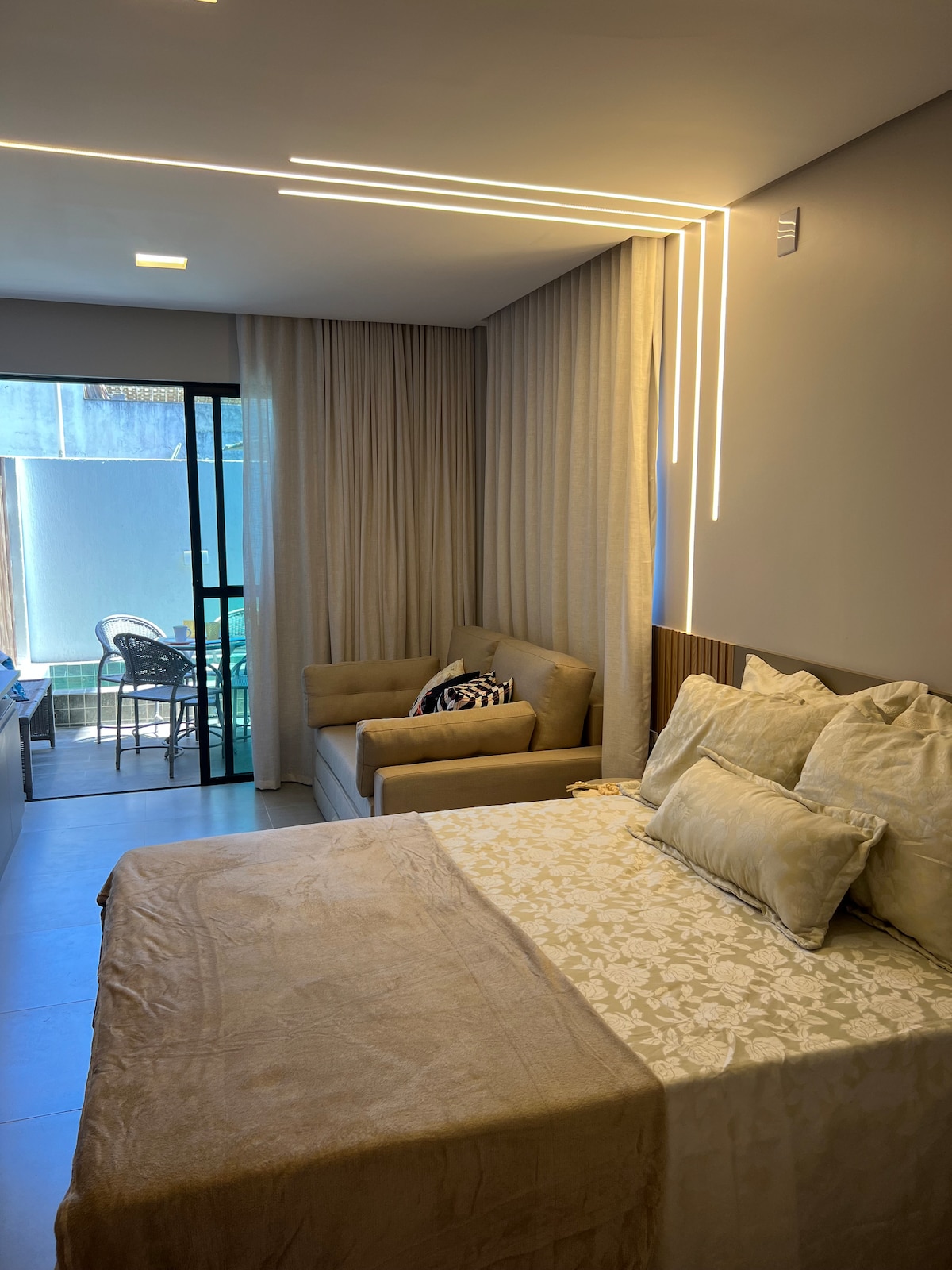 Estudio en Marulhos Suites Resort. Cama queen, dos camas, colchón extra, aire acondicionado, buena conexión a internet y smart tv. La cocina tiene nevera, gelágua, cafetera, sandwichera y otros utensilios de cocina. Acogedor apartamento frente a las piscinas. El hotel es de primera, cuenta con varias piscinas, sauna, gimnasio, canchas de fútbol y tenis, zona de juegos y recreación todos los días para los niños. Llevo unos años alquilando este y otros pisos en Muro Alto, ¡así que puedes confiar!