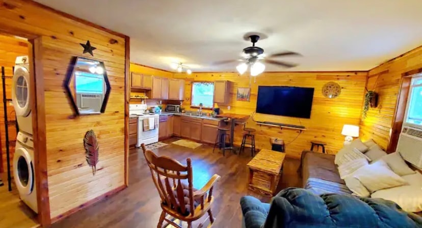 El Ozark Hideaway se encuentra en 90 acres boscosos a 8 millas de Gainesville, MO (hogar de Hootin-n-Hollerin) en el condado de Ozark en un camino de grava bien mantenido. La vida silvestre abunda mientras caminas por los senderos marcados o te calientas junto a la hoguera. La acogedora sala de estar ofrece una chimenea de gas. El espacio para dormir incluye una cama tamaño queen en el dormitorio bellamente amueblado, un sofá en la sala de estar y una cama individual en el loft. Hay una cocina totalmente equipada. El espacioso baño tiene una ducha a ras de suelo y lavadora/secadora.