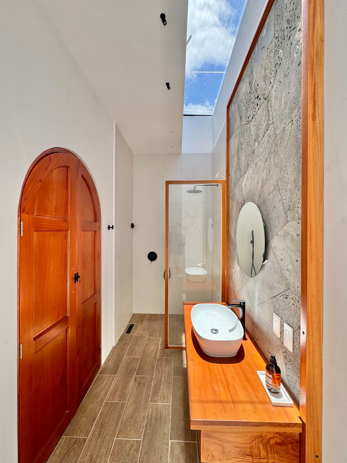Aquí el tiempo baja el ritmo. La piedra chuleta, lava volcánica de Galápagos, se combina con madera natural, arcos suaves y luz cálida para crear un espacio sereno y acogedor. Un refugio íntimo para dos, pensado para descansar, leer, cocinar sin prisa y habitar la calma.