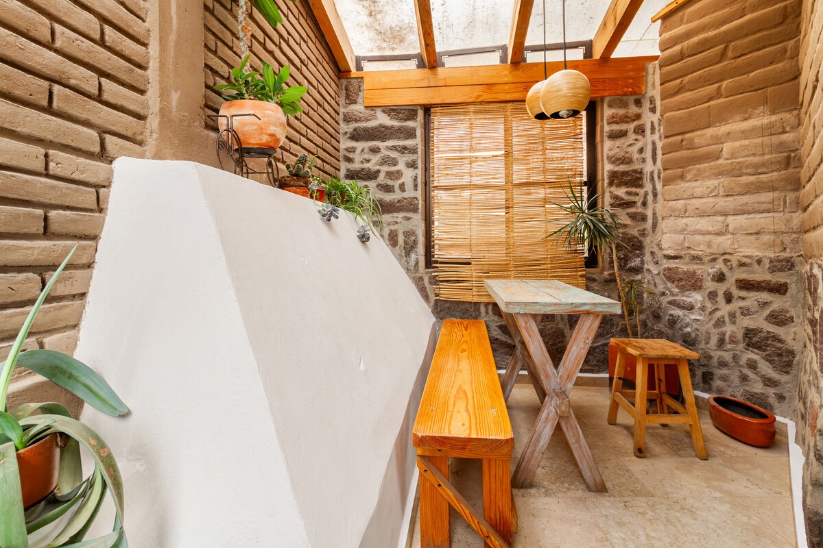 Es una cabaña de construcción ecológica ideal para parejas, o una familia, tiene jardín, en su interior encuentras la acogedora arquitectura de madera y adobe, descubrirás cómo todos los espacios fueron diseñados para descansar y disfrutar la convivencia, está ubicada en un típico barrio mexicano a 20min caminando de la plaza principal. A beautiful cabin made from ecological materials, it has a Garden, In the interior you will find how every space was design for resting