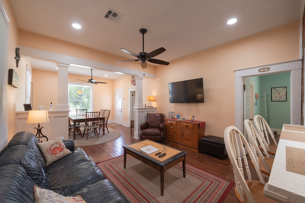 -Casita De Palmera- Relax on the lighted, palapa-covered deck with your coffee or cocktail! Family + pet friendly! Less than a half mile to Galveston's Historic Downtown area and a short 4 minute drive to the beach! Close to all of the fun, shopping, live music and restaurants on The Strand! -Fenced backyard -800+ MBPS Wifi -4 Smart TVs w/ Roku capability to stream with your accounts -Arcade & board games -Wood Grill -Beach towels & toys Close to cruise terminals & ONE block to cruise parking!
