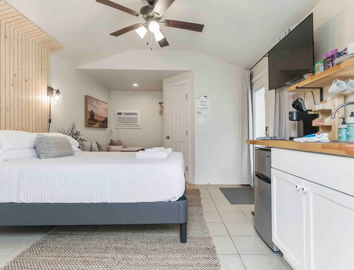 ¡La escapada perfecta con todos los servicios de un alojamiento! Esta minicasa en el patio trasero es el lugar perfecto para 2. Cama tamaño queen, cocina pequeña con café, microondas y mininevera. También te proporcionamos platos para llevar. Smart Tv. WiFi también lo convierte en el lugar perfecto para la distancia social y trabajar de vacaciones si es necesario. Mesas junto al sofá para comer o trabajar. Aunque el patio trasero se comparte con los huéspedes de la casa principal, es muy exuberante y tiene múltiples espacios para sentarse para tu propia privacidad.