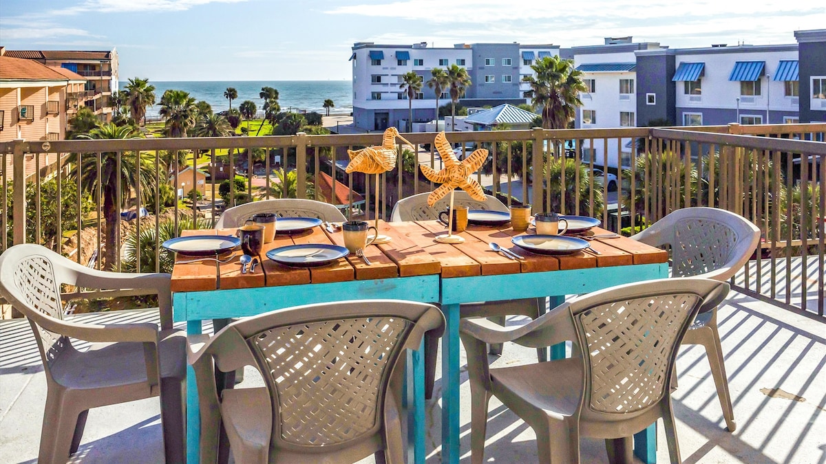 Apartamento frente al mar con vistas impresionantes Disfruta de tu estancia en nuestro espacioso condominio de 2 dormitorios y 2 baños en Galveston. Disfruta de las vistas al mar desde el balcón, la sala de estar y el dormitorio principal mientras disfrutas de las comodidades. Hay una piscina, un jacuzzi, cancha de tenis/cancha de pickleball y área de barbacoa. 🌟Capacidad para 6 personas. 🌟Cama tamaño king cama 🌟tamaño queen 🌟sofá cama 🌟colchón inflable 🌟Cocina totalmente equipada. 🌟Balcón privado amueblado Equipo de 🌟playa incluido: toallas, vagón, sillas, sombrilla, nevera