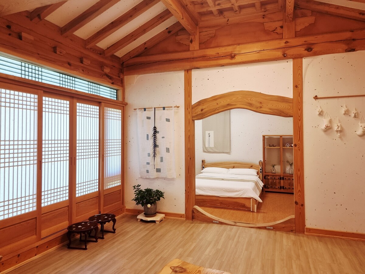Es una estancia privada en una casa tradicional coreana (hanok) de unos 60 años de antigüedad, renovada. Con un tamaño de 661.5 m², tiene un patio delantero y trasero. En el amplio suelo de tina debajo del pajar, junto a la naturaleza Dejaremos nuevos recuerdos con tranquilidad. Es la primera vez, así que no estoy listo, pero estoy tratando de comunicarme con los huéspedes y disfrutar de la operación. Aunque no sea suficiente, lo prepararemos cuidadosamente El número máximo de personas que pueden alojarse es de 4 a 5 personas. Hay un cargo adicional de 30.000 wones por persona adicional por noche. Pago en el acto. (Se proporcionan toper y edredón adicional) Si el número de viajeros supera los 5, por favor, consúltelo con nosotros con antelación. @ Uso gratuito de la barbacoa interior individual (se proporciona parrilla de gas y utensilios) @Jacuzzi de uso durante las cuatro estaciones (se proporciona gel de ducha) Crea buenos recuerdos con tus seres queridos