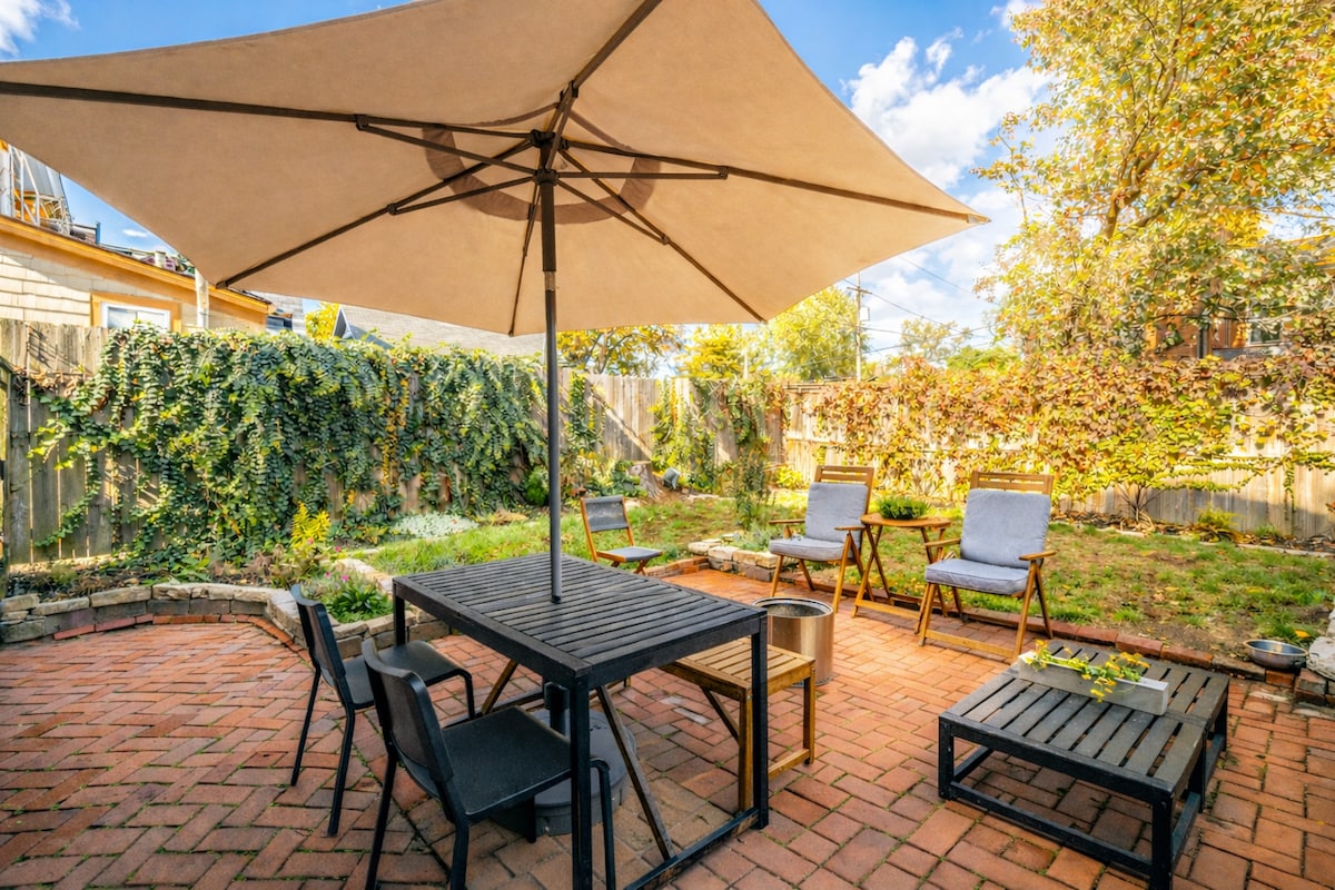 Bienvenido a tu elegante casa adosada de ladrillo en el histórico Merion Village, a 1 cuadra de German Village. - A poca distancia de parques, restaurantes y cafeterías. - Cocina recién remodelada con estufa de gas. - Sofá de cuero y TV Samsung Frame en la sala de estar. - Patio privado vallado con asientos. - Camas tamaño king y queen. - Wifi rápido y servicios de lavandería. - Muchos estacionamientos en la calle. - Se admiten perros (caso por caso)