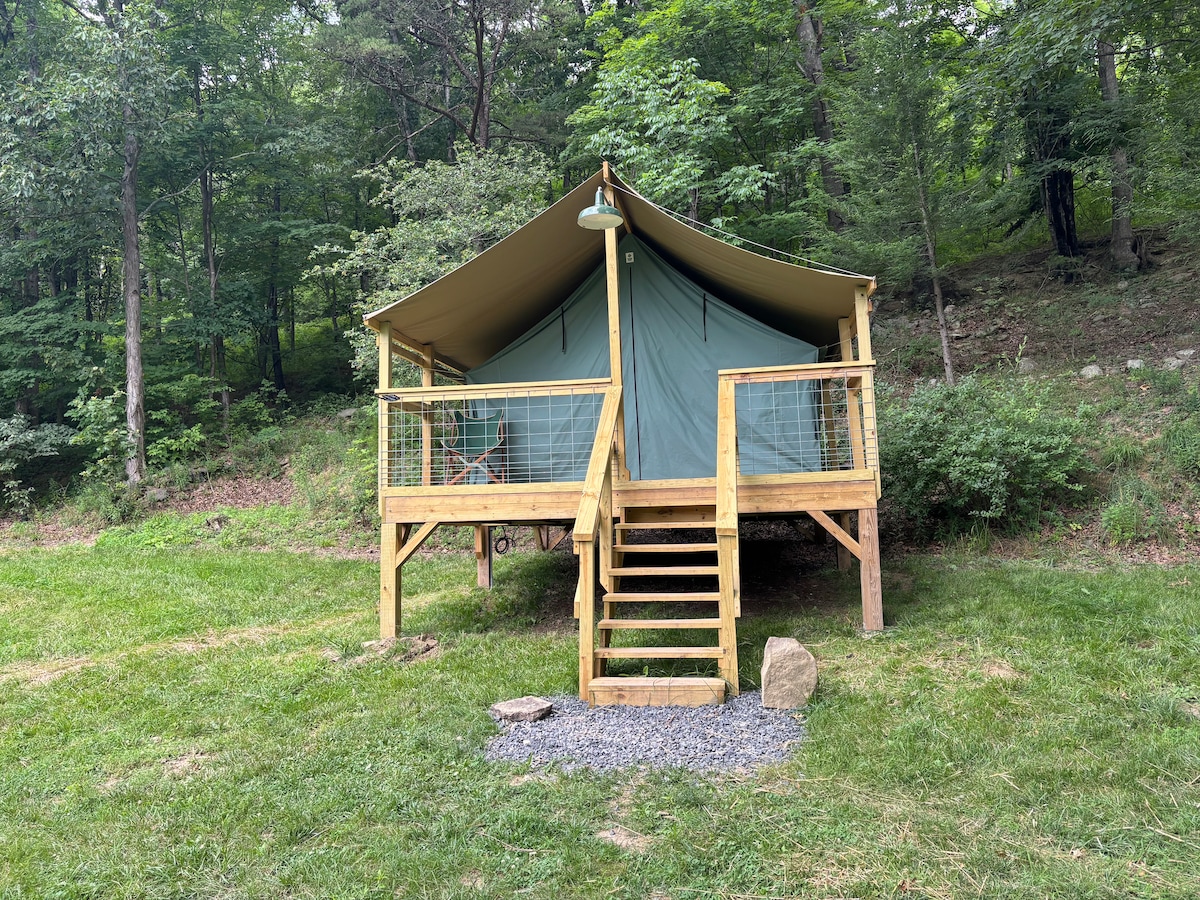 Glamping es una experiencia de camping única en Virginia Occidental, que le permite volver a conectarse con la naturaleza. La actividad de acampar con algunas de las comodidades y lujos del hogar. Nuestras tiendas de campaña ofrecen un montón de los que debes tener y no quieres estar sin cuando escapes de la ciudad. AIRE ACONDICIONADO/CALEFACCIÓN, ropa de cama fresca, nevera, microondas, alfombras, wifi, electricidad y mucho más.