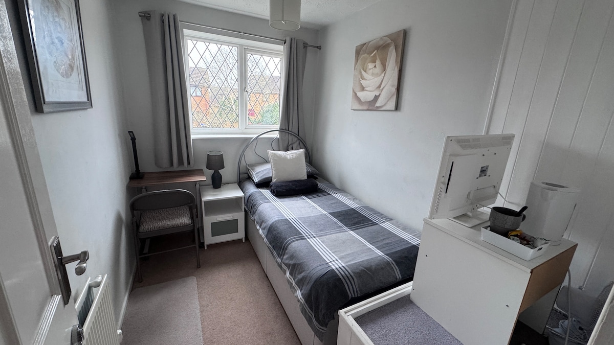 This is a well-maintained studio annexe which is detached from the main house. It has independent access and has a single bed. The annexe comes complete with its kitchenette including a washer dryer, electric cooker, microwave, toaster, kettle, and fridge freezer. The annexe has a smart TV & free Netflix. Less than 10 mins drive to Northampton town centre & the Motorway. Ideal for anyone looking for a short stay in Northampton.