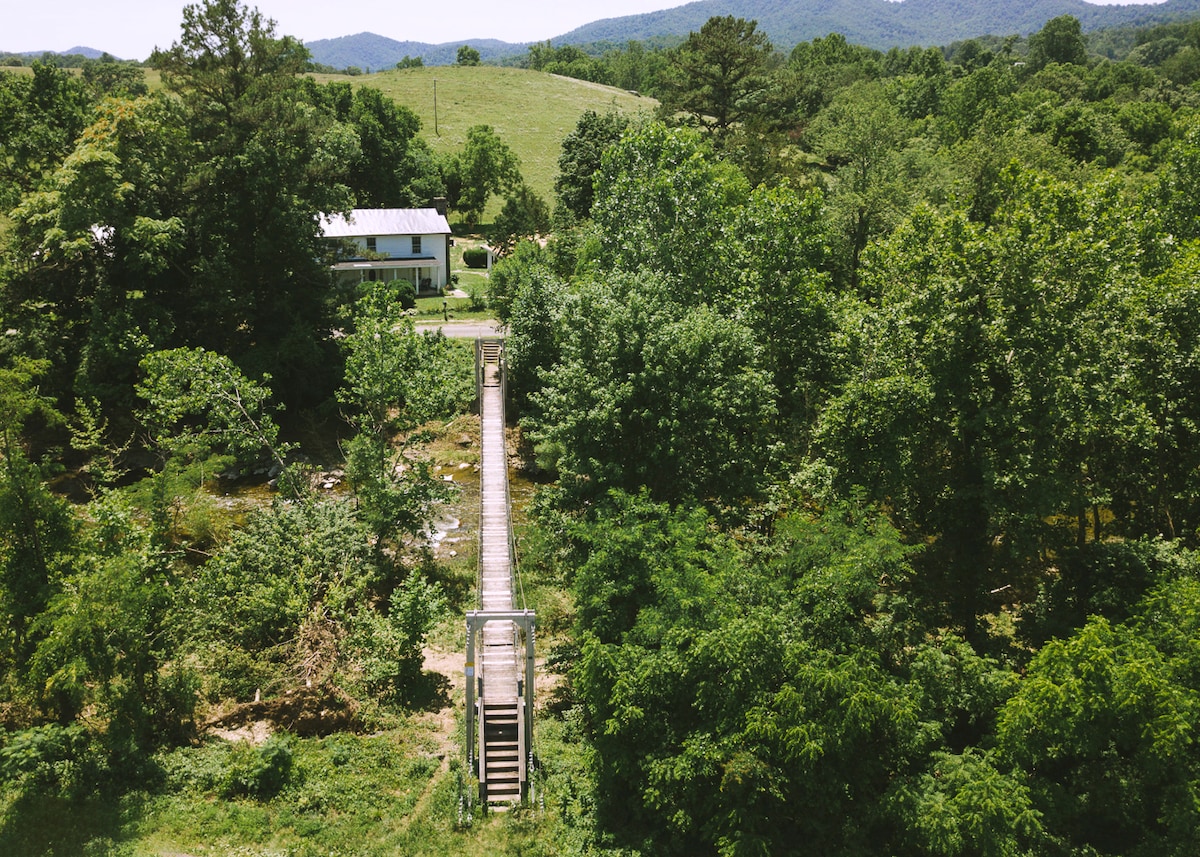 The River House at the Swinging Bridge es una propiedad de 13 acres que incluye un complejo vallado de 2 acres ideal para reuniones de familias o amigos. Con 1000 pies de frente al río Robinson, un bosque privado para caminar, un bañera de hidromasaje de agua salada Caldera, una sauna de leña, una piscina natural y un montón de juegos y lugares de reunión, uno no necesita salir de la propiedad para disfrutar. Pero abundan las rutas de senderismo y ciclismo, y las cervecerías y los viñedos están a pocos minutos.