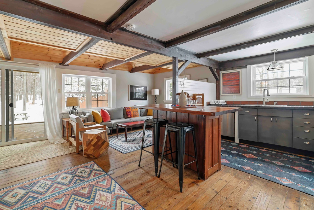 Rústico se encuentra contemporáneo con esta cabina de madera actualizada. desde las encimeras de granito, pisos de nogal, y las puertas recuperadas construidas a medida en el interior, a los amplios niveles de envoltura alrededor de las cubiertas fuera de esta casa grita lujo. está a poca distancia del lago Wallenpaupack donde si se desea hermoso pontón bennington está a la espera de ser alquilado. Ven a experimentar la sensación ultramoderna y la sensación de relajación que ofrece este alojamiento