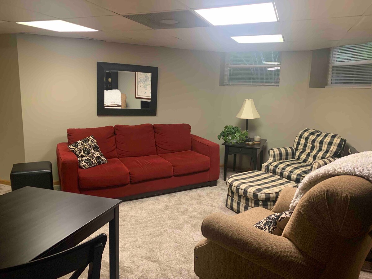 Nuestro espacio hogareño incluye baño completo, cocina pequeña, sala de estar y cama tamaño queen súper cómoda. El acceso directo a la unidad desde la puerta trasera exterior facilita las idas y venidas. Situado en University Ave., a solo unos minutos a pie de la Universidad de Chicago, fácil acceso al transporte público que te lleva al centro de la ciudad en poco más de media hora. *Nota* Esto está en el sótano de nuestra casa. Cerraduras interiores en las escaleras desde el lado del sótano para garantizar la privacidad de los huéspedes. Nos oirás arriba a veces.