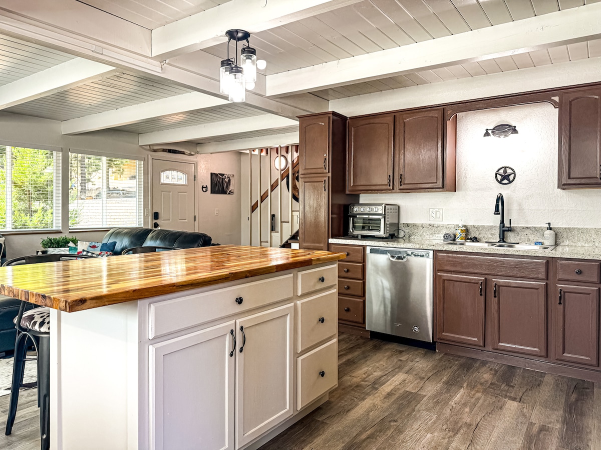¡A 20 millas de Yosemite! Disfruta de 1.900 pies cuadrados de comodidad en la montaña con un loft arcade, wifi rápido y una acogedora chimenea. A las familias les encanta nuestra cocina surtida, silla alta y cuna, juegos de mesa y patio trasero espacioso para barbacoas bajo los pinos. Tres cómodos dormitorios duermen ocho en sábanas de calidad hotelera; dos baños completos están llenos de toallas de felpa y elementos esenciales. El estacionamiento privado, la lavadora/secadora y el registro automático hacen que tu estadía sea fácil. ¡Reserva tu aventura en Yosemite hoy mismo!