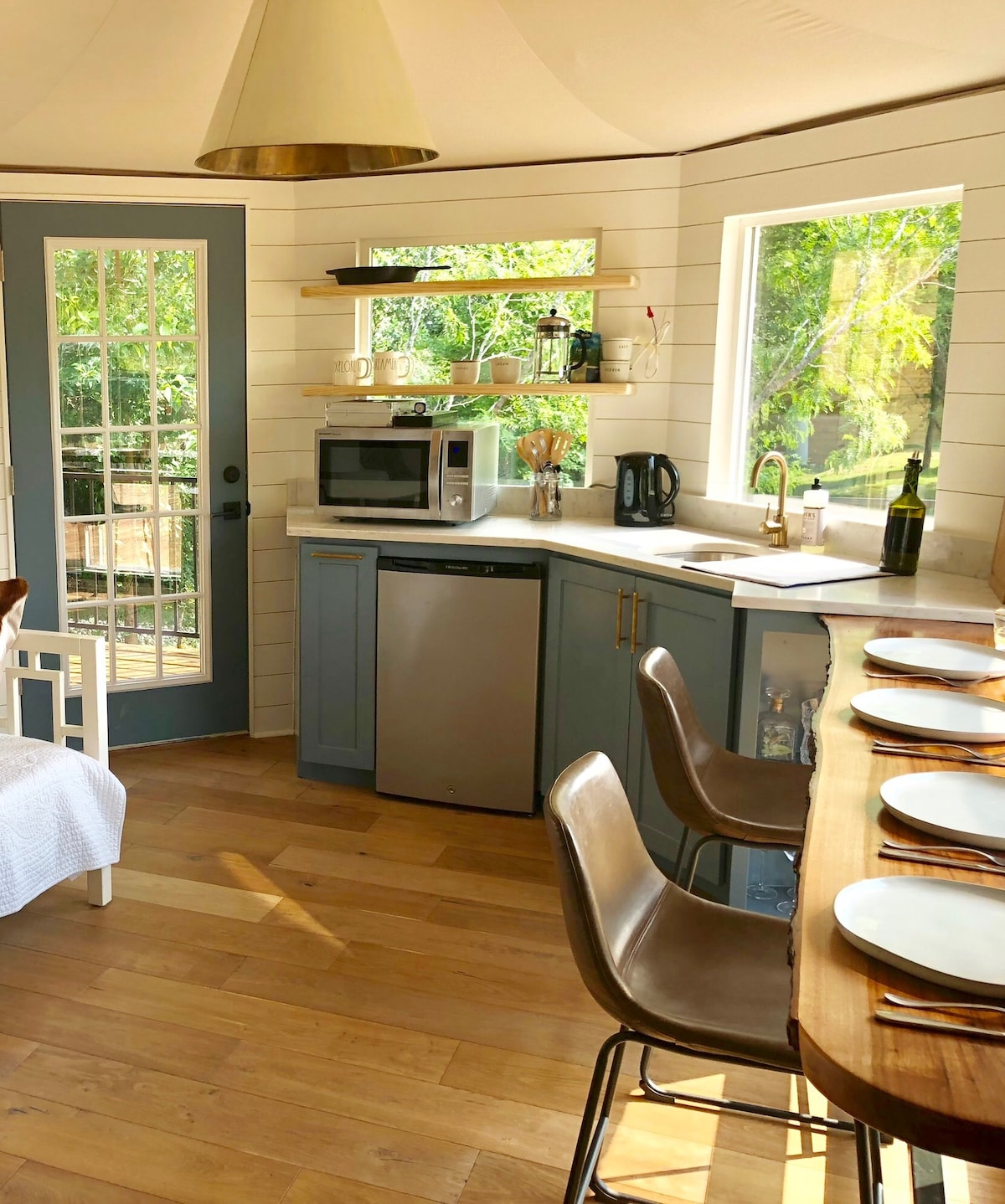 Este lujoso centro vacacional glamping está ubicado en 100 acres de incomparable naturaleza en el río San Marcos. Esta tienda combina comodidades de lujo con el aire libre para crear una experiencia verdaderamente única. El moderno baño cuenta con una gran ducha y una bañera de hidromasaje. Hay una zona de cocina equipada con nevera y congelador, microondas y cafetera. La sala de estar se extiende al aire libre en la amplia terraza privada. También hay una ducha exterior para una experiencia verdaderamente única.