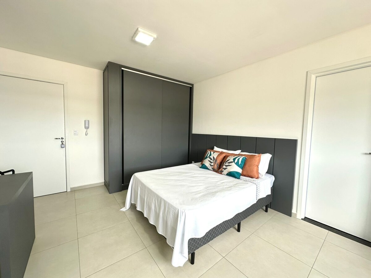 Estudio nuevo, completo, práctico y acogedor, a pocos metros de Campo Real y Unicentro. Check-in a partir de las 15:00 h y check-out a las 12:00 h. Cuenta con cocina equipada, conexión Wi-Fi rápida, TV inteligente, cama tamaño queen con ropa de cama de primera calidad, baño completo. Región con una gran variedad de servicios, opciones de comida y ocio cerca. Tiene una piscina y un gimnasio. Está en el séptimo piso, un edificio con 2 ascensores y una lavandería compartida. Ponte cómodo y como en casa. Es un placer hospedarte a Sera.
