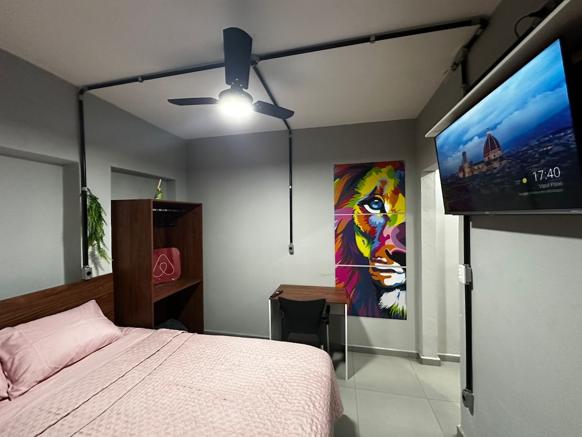 pausa para relajarte en este sereno oasis. Espacio cómodo con sala de estar americana y baño, todo un ambiente familiar independiente y tranquilo para ti que vengas por trabajo o estudio.