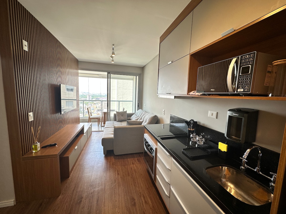 Estudio recién amueblado, diseñado para aquellos que valoran un entorno funcional, elegante y bien ubicado. El alojamiento tiene capacidad para 2 personas y ofrece una cocina completa con electrodomésticos nuevos, una sala de estar con sofá y un televisor inteligente giratorio (dormitorio/sala de estar), una cama doble, un baño moderno con una gran ducha y un balcón con una mesa de comedor. Ideal para estancias de negocios o de placer, con espacio para una oficina en casa y una estructura diseñada para una experiencia práctica, eficiente y acogedora en Guarulhos.
