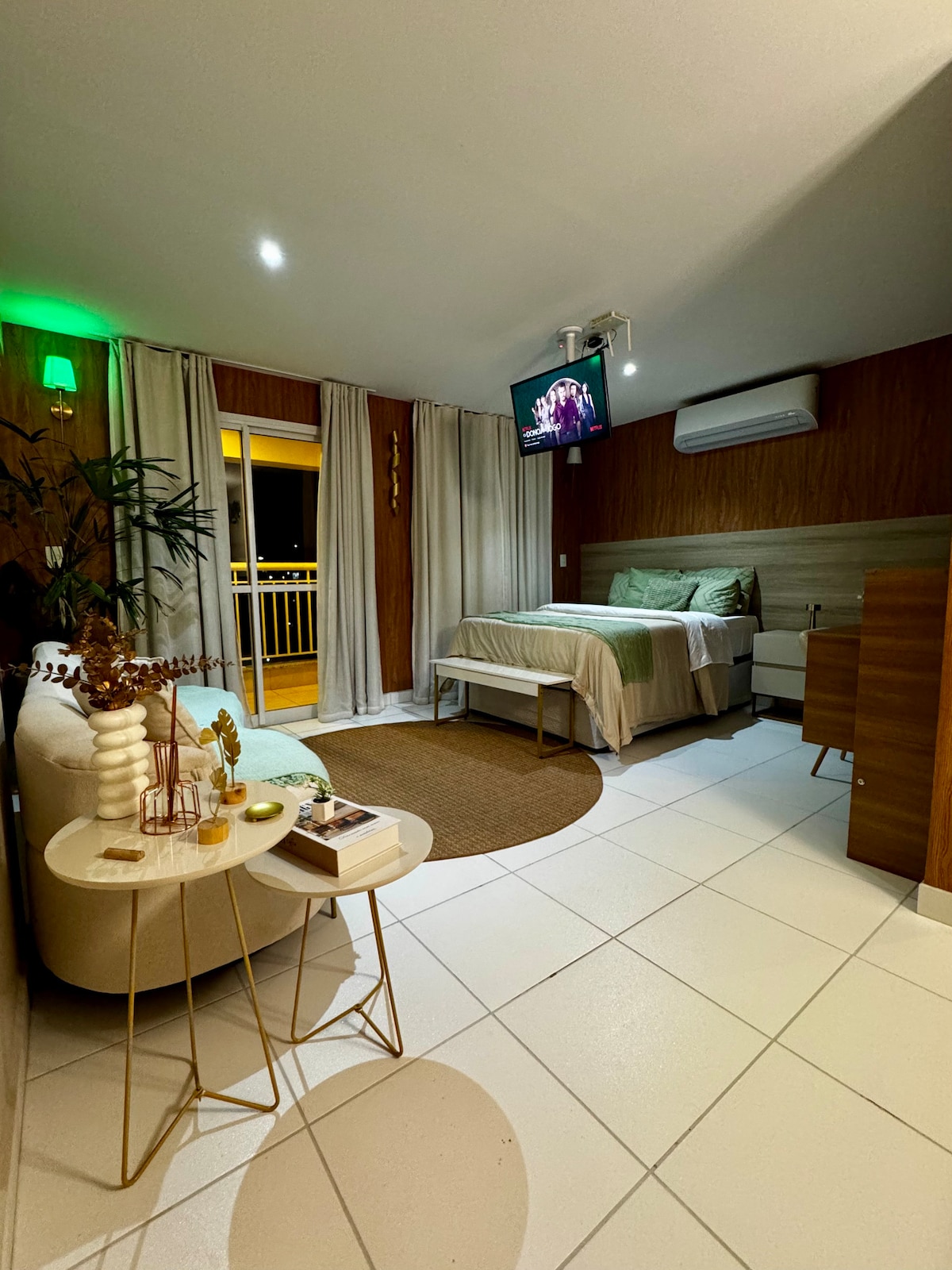 Studio recém-mobiliado, projetado para quem valoriza um ambiente funcional, elegante e bem localizado. A unidade acomoda até 2 pessoas e oferece cozinha completa com eletrodomésticos novos, sala com sofá e TV smart giratória (quarto/sala), cama de casal, banheiro moderno com ótimo chuveiro e sacada com mesa de jantar. Ideal para estadias de negócios ou lazer, com espaço para home office e estrutura pensada para uma experiência prática, eficiente e acolhedora em Guarulhos.