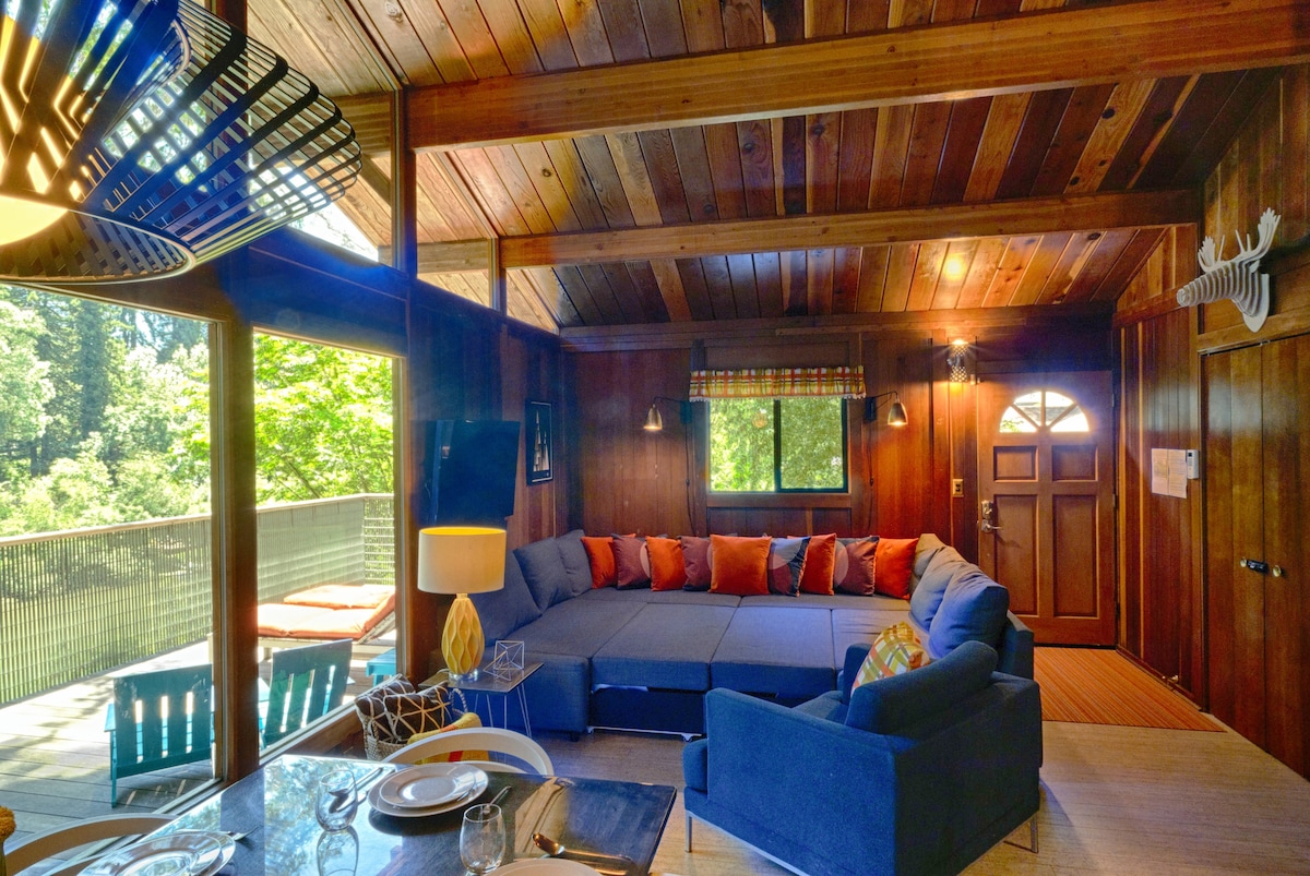 Artist's Perch ~ Ubicado entre majestuosas secuoyas costeras, Artist's Perch ha sido completamente reinventado, por dentro y por fuera, por un diseñador de interiores emergente de San Francisco. La casa combina un diseño refinado con serenidad natural, con toques cálidos y artísticos en todo y una impresionante sauna al aire libre eslovena importada para lo último en relajación. Entra en una cocina totalmente equipada que te invita a cocinar comidas inspiradas, ya sea que prefieras cenar en el interior o asar al aire libre bajo las secuoyas.