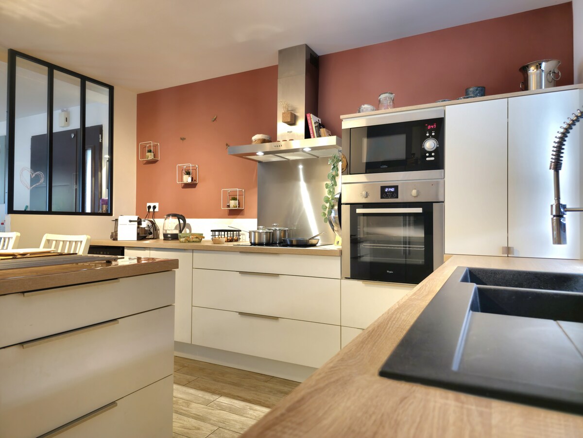 Casa antigua reformada, con 2 dormitorios y una gran sala de estar, lavavajillas, horno, microondas, hervidor, cafetera Tassimo, tostadora. Vistas al campo y a los caballos. Fibra de alta velocidad para teletrabajo. Para 1 persona o para 5 cómodamente, y un sofá cama para 2 . A menos de 5' del Parque Expo de Rennes, del aeropuerto, y a 10' de Rennes. A pocos minutos del Golf de Cicé Blossac o de St Jacques de La Lande. Entre Bruz y Goven. Acceso fácil y rápido por la 4 vías.