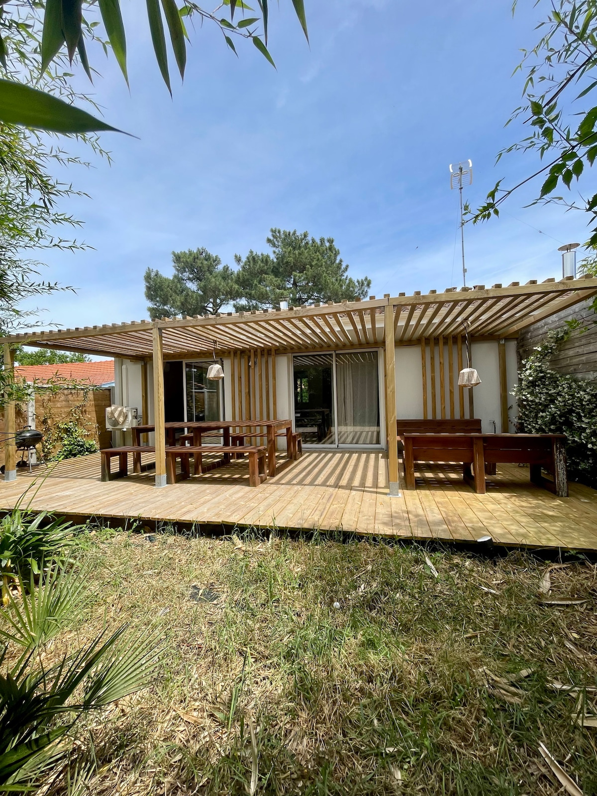 * Ideal para familias, parcela sombreada/cercada, wifi gratuito * Chalet climatizado 35m2 + terraza cubierta cerrada 10m2 (apertura posible con buen tiempo), terraza de madera 22m2 con tumbonas/chilenas * Piscina con toboganes (mayo-septiembre) * Parque residencial de ocio de 4 estrellas, en el corazón del bosque, muchas actividades: tenis, parque de escalada para niños, estadio de la ciudad, áreas de juegos para niños, restaurante-bar-tienda de comestibles... * A 15 minutos de la duna de Pyla, la cuenca de Arcachon, Aqualand, el zoológico, las playas oceánicas...